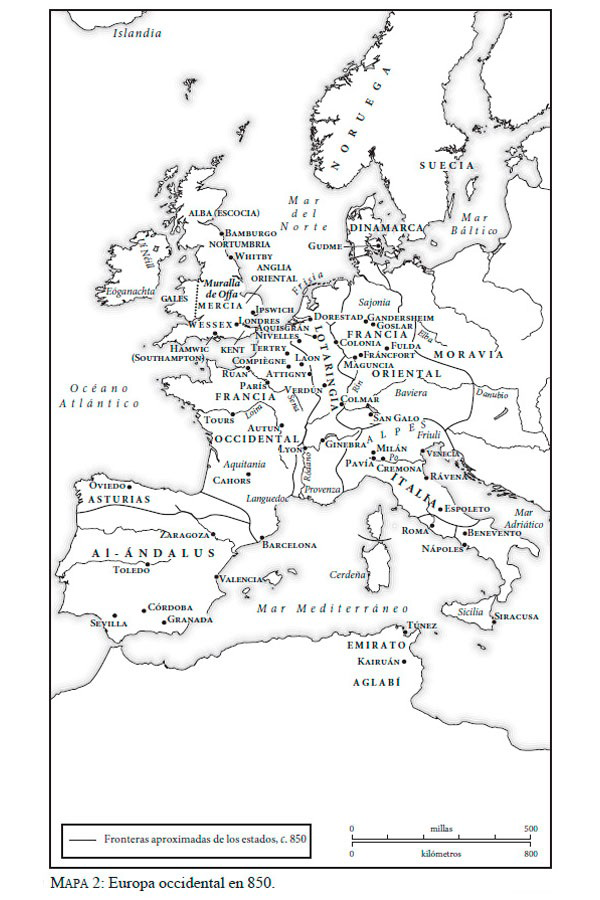 Mapa 2. Europa occidental en 850. En Chris Wickham, Europa en la Edad Media. Una nueva interpretación (Barcelona: Crítica, 2018), 10.