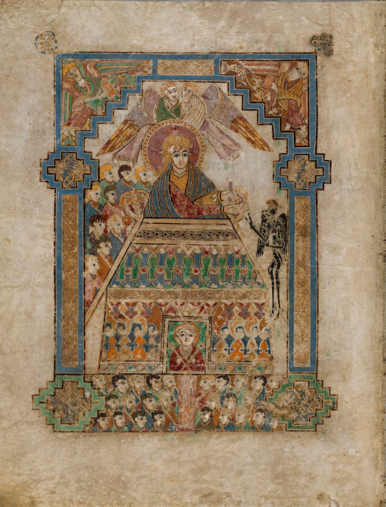 - Book of Kells. Folio 202v: Luke; Temptation of Jesus. Trinity College Dublin. Acceso el 1 de noviembre de 2025 https://www.visittrinity.ie/book-of-kells-pages-on-display/ ↩︎