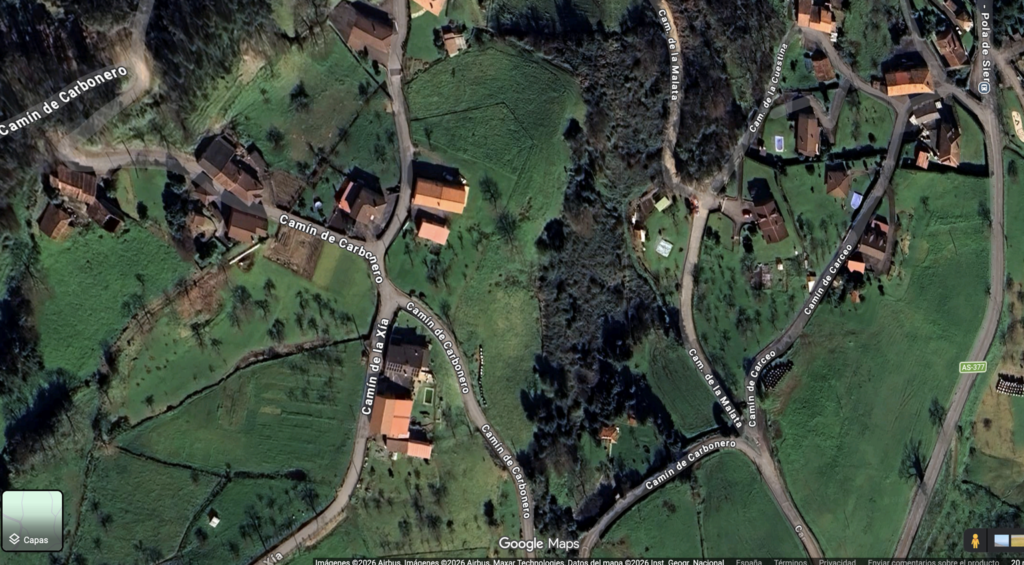 Figura 1. Red de caminos y microtoponimia en el entorno de Ranón (Gijón). Nombres como “Camín de Carbonero” o “Camín de la Malata” conservan la memoria de usos, actividades y recorridos históricos del territorio. Fuente: Google Maps.