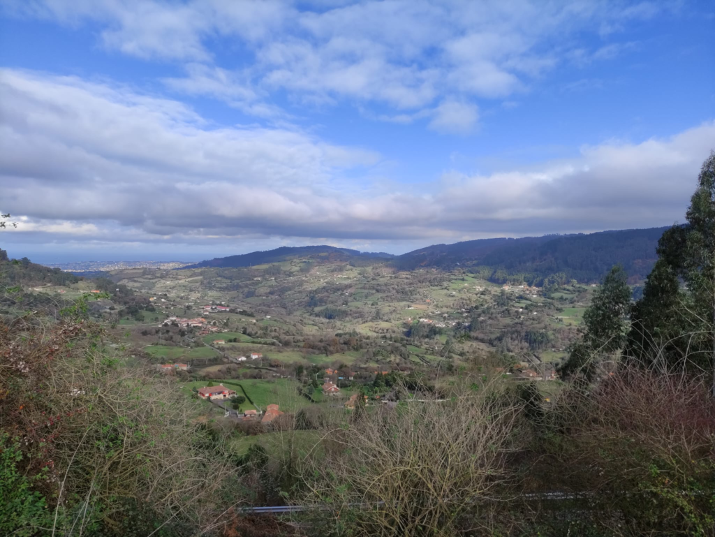 Figura 2. Valle de Ranón (Gijón), con el monte Deva al fondo. Un paisaje donde la disposición del hábitat, el parcelario y la red de caminos reflejan la organización histórica del territorio. Fotografía del autor.